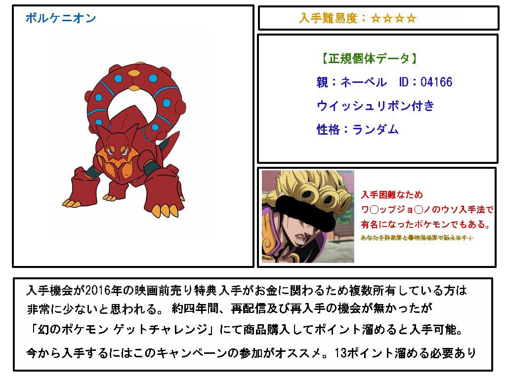 マギアナは、劇場版『ボルケニオンと機巧のマギアナ』来場者プレゼントで貰える「ガオーレディスク」のqrコードを使うことで入手できる。 リリース スクエニ新作『ディープインサニティ アサイラム』配信開始!配布期間 16年11月18日 (金) ~ 入手映画「ポケモン・ザ・ムービーXY ボルケニオンの色違い比較 ボルケニオンもフーパと同様に全然違いますよね! 赤を基調としていましたが、それらはすべて黄色に! 最近こうして色違いのボルケニオンを見ると・・・、ゼラオラの色に若干似ているなぁと。 電気タイプになっていてもおかしくないレベルだ!